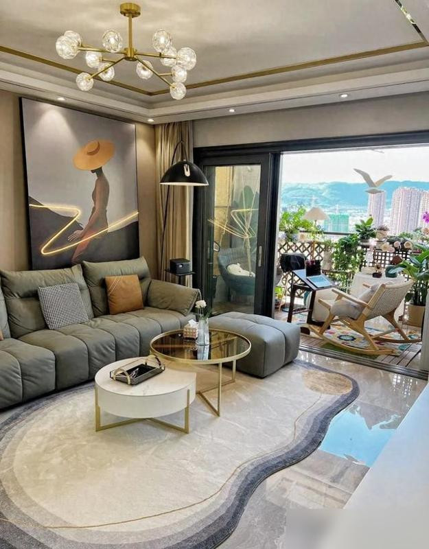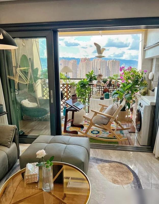 最聪明的是她把阳台和客厅“连”得特别顺——客厅铺的灰色地砖耐脏,木饰背景墙暖乎乎的,刚好接住阳台的绿;玻璃门一推,视线从沙发直接落到吊椅上,没有半点隔断感。你看现在好多人家的阳台,要么堆成快递杂物间,要么改成洗衣房,明明是“家里最靠近天空的地方”,却活成了“最没存在感的角落”。她倒好,把阳台变成了“第二客厅”:朋友来玩,不用挤在沙发上抢遥控器,直接搬个小桌子到阳台,摆点水果零食,晒着太阳聊天,比去网红咖啡馆有意思多了——毕竟咖啡馆的阳光是“共享的”,阳台的阳光是“专属于你的”。