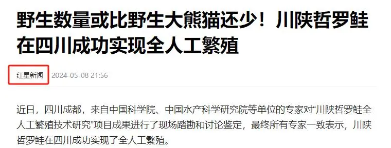 红星新闻《野生数量或比野生大熊猫还少!川陕哲罗鲑在四川成功实现全人工繁殖》,2024-5-8