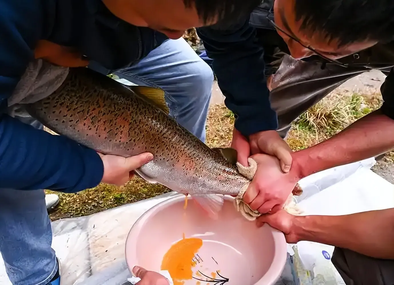 他们第一次捕到了两雌一雄三条川陕哲罗鲑,之后科研人员们立即在江边给这三条鱼进行助产,取到了第一批受精卵之后带回了基地。